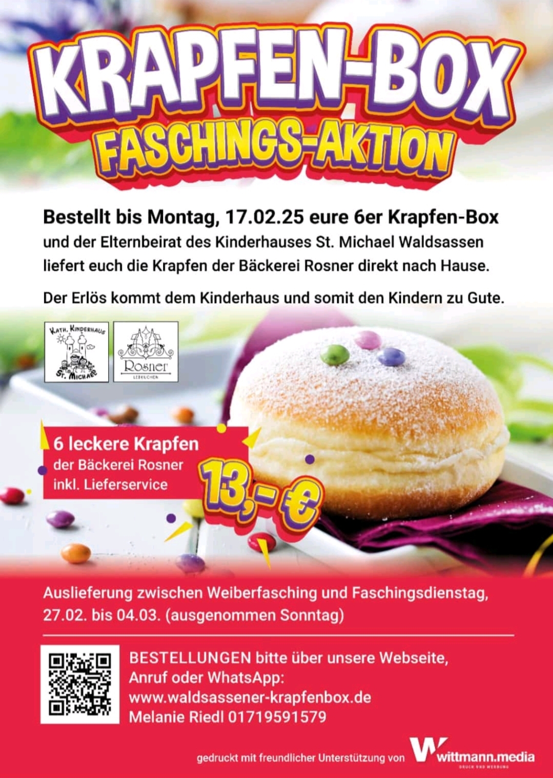 Bestellt bis Montag, 17.02.25, eure 6er Krapfen-Box und der Elternbeirat des Kinderhauses St. Michael Waldsassen liefert euch die Krapfen der Bäckerei Rosner direkt nach Hause. Der Erlös kommt dem Kinderhaus und somit den Kindern zu Gute.